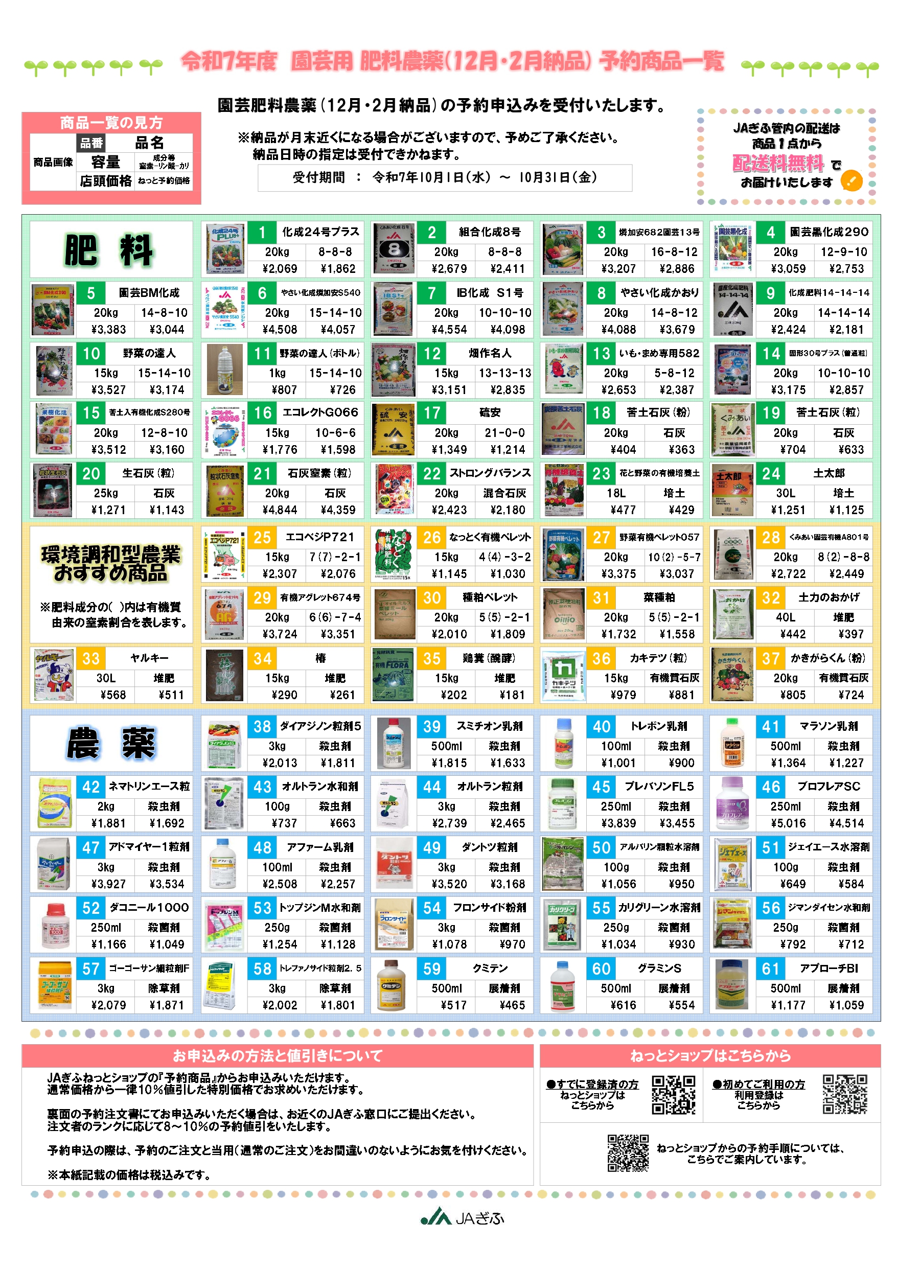 12月と2月に納品させていただきます、園芸用肥料農薬の予約を10/1~31まで受付いたします。詳しくはJAぎふ広報誌「ふれあいねっと」に同封のチラシをご覧ください。