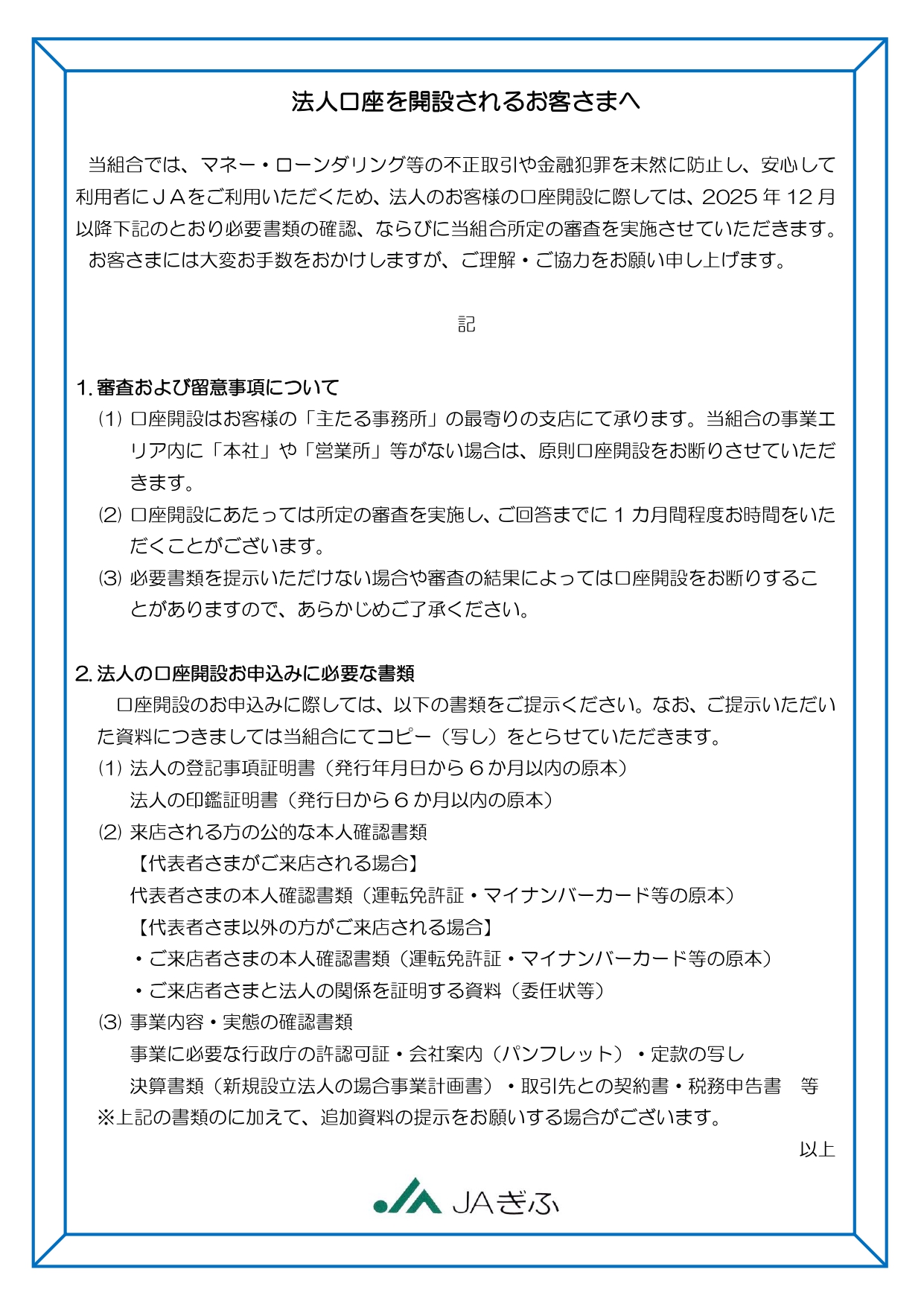 当組合では、マネー・ローンダリング等の不正取引や金融犯罪を未然に防止し、安心してJAをご利用いただくことを目的として、新たに口座開設を希望される法人のお客さまには、確認書類のご提出ならびに口座開設にかかる審査を実施させていただきます。審査の結果によりましては、口座開設をお断りする場合もございます。
