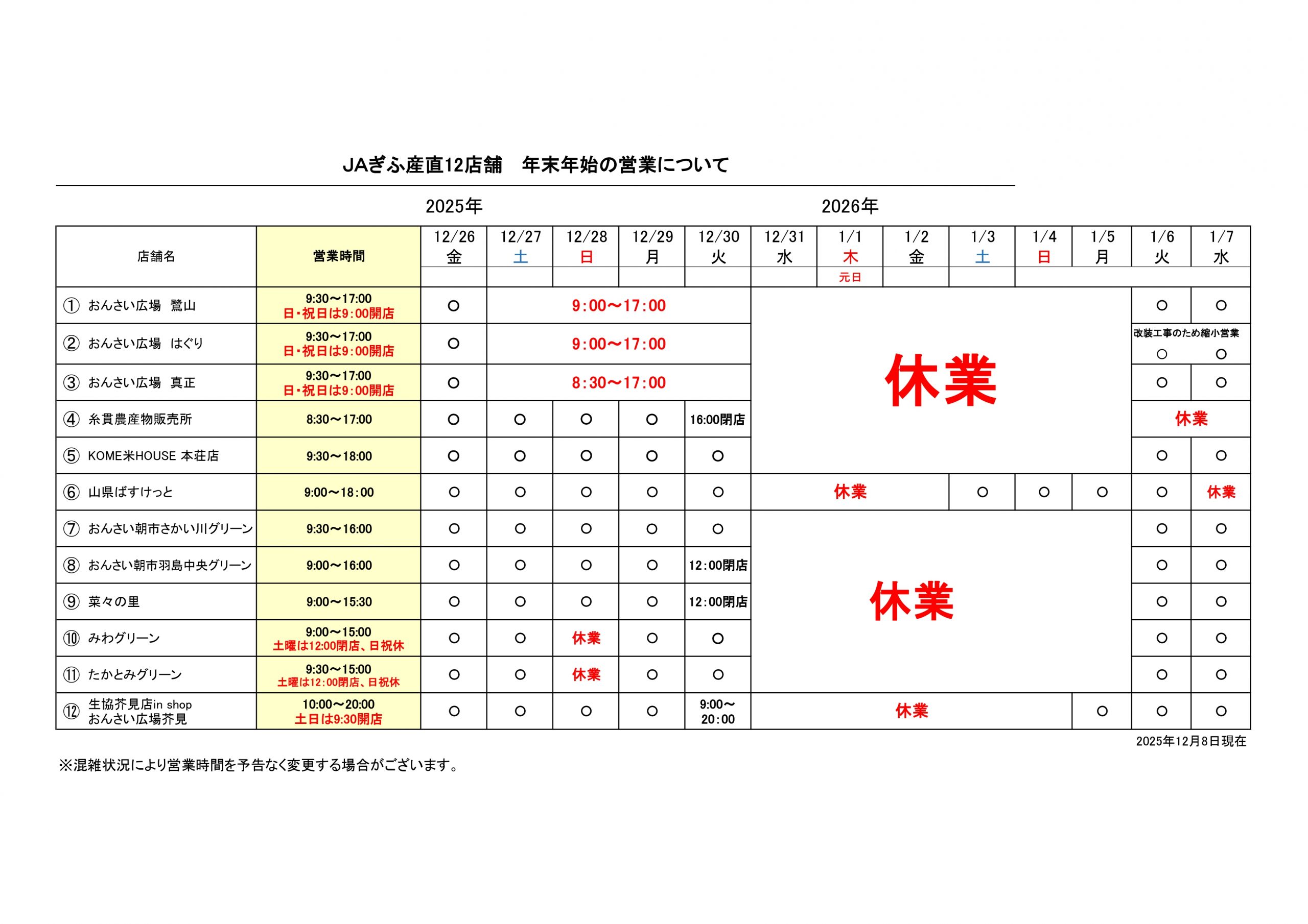 令和7年度 JAぎふ産直12店舗 年末年始の営業について