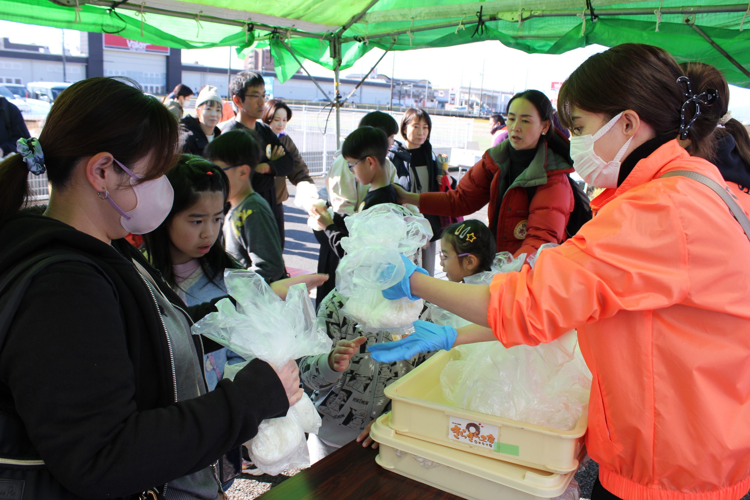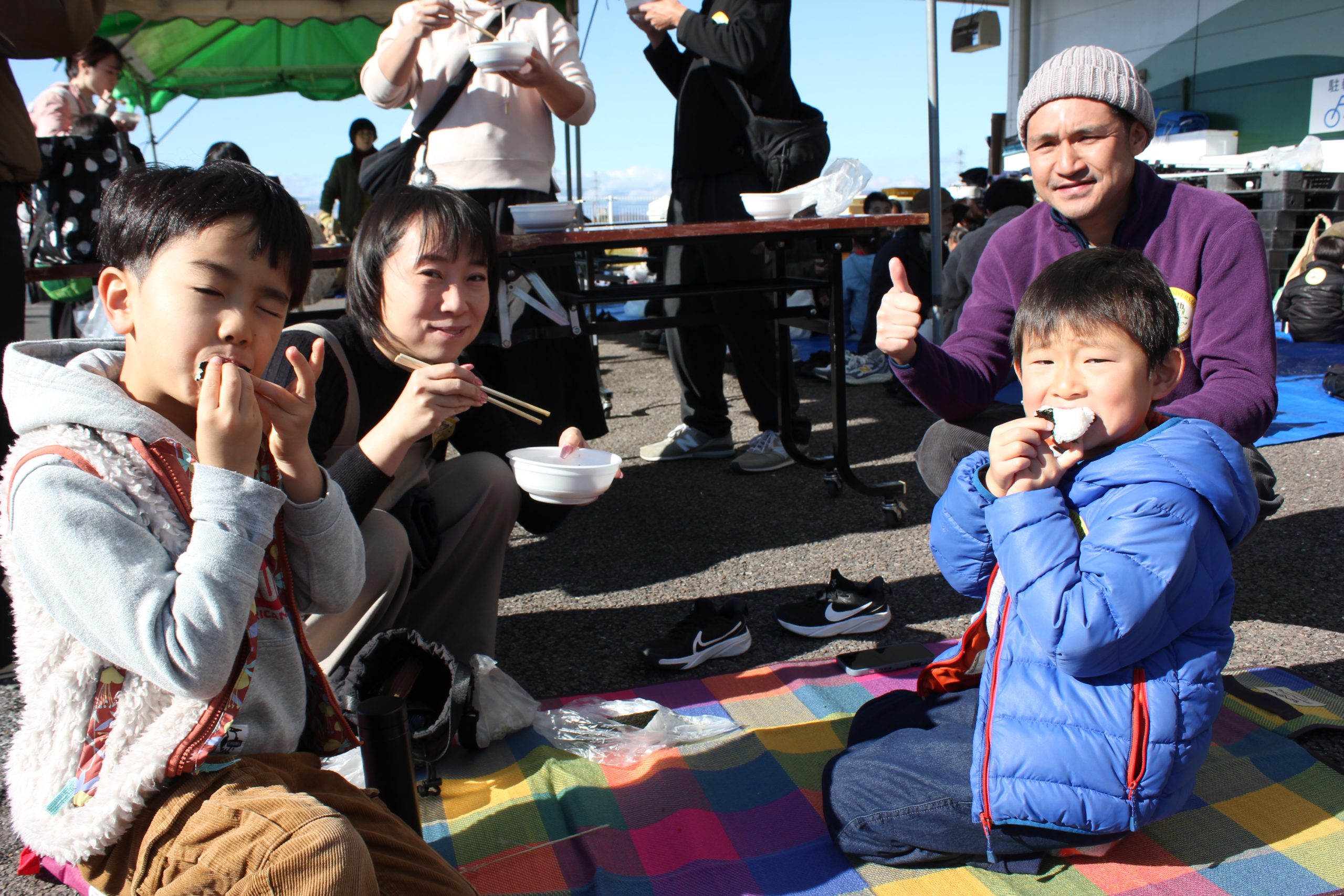 JAぎふは12月6日、環境と調和した農業と地消地産を学ぶ機会の場として開校した農業スクール「田んぼに おんさい‼」の最終回(収穫祭)を岐阜市下土居にある産直店舗「おんさい広場鷺山」で開き、親子20組68人が参加しました。会場は「おんさい広場鷺山」周辺や水田の畦で、田植えから稲刈りをした思い出を家族や指導してくれた下城田寺営農組合のメンバー、JA職員と振り返りながら自分で握ったおにぎり2個と豚汁を食べました。
