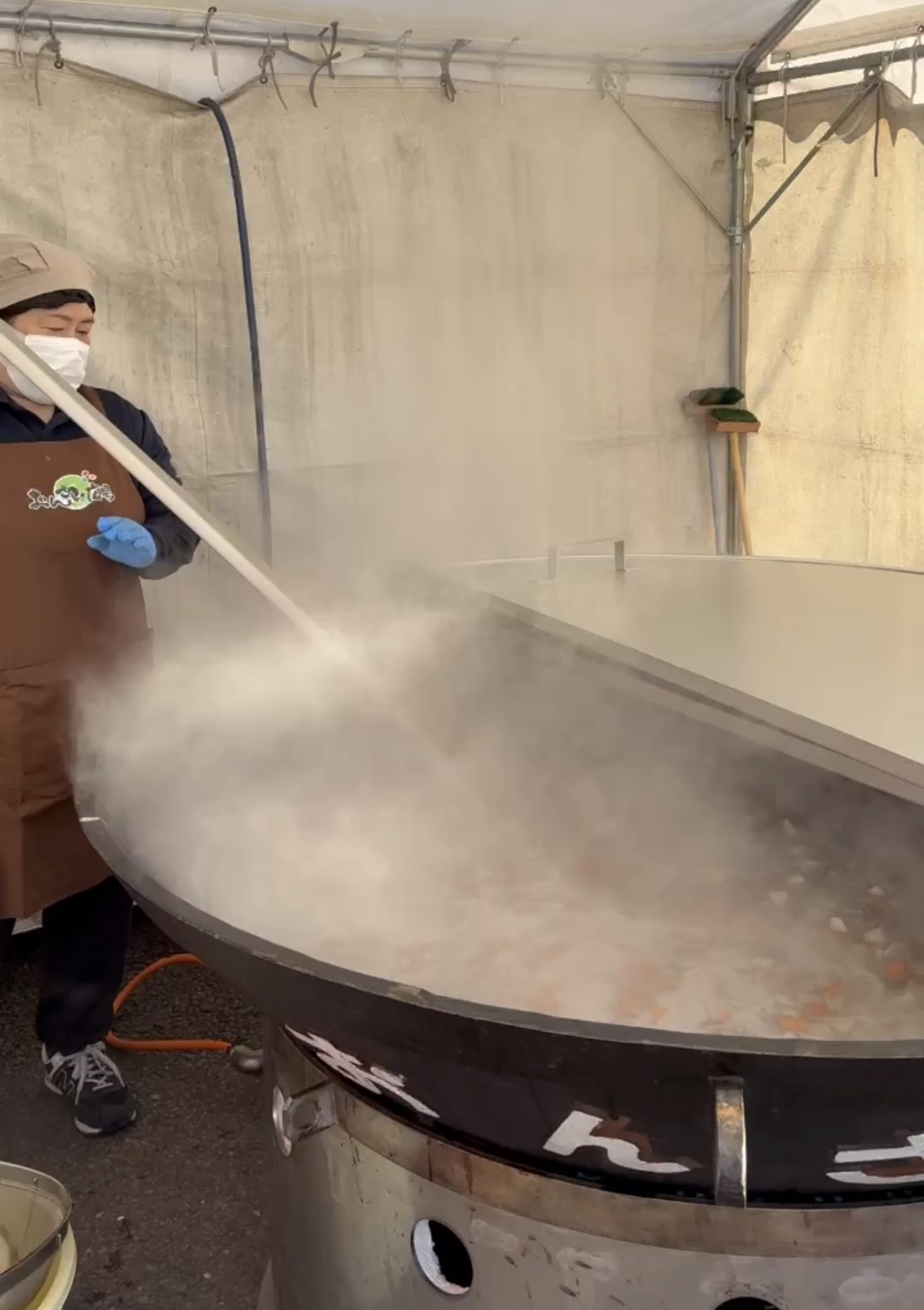 有機農業の日(12月8日)を前にJAぎふは12月6日、環境に配慮した栽培基準「ぎふラル」で栽培された農産物を直径1.6㍍の大鍋で煮込んだ「おんさい鍋(豚汁)」を、JAぎふ産直店舗「おんさい広場鷺山」の来店者(先着800名)に振舞いました。「ぎふラル」農産物を使った「おんさい鍋」は初の試みです。