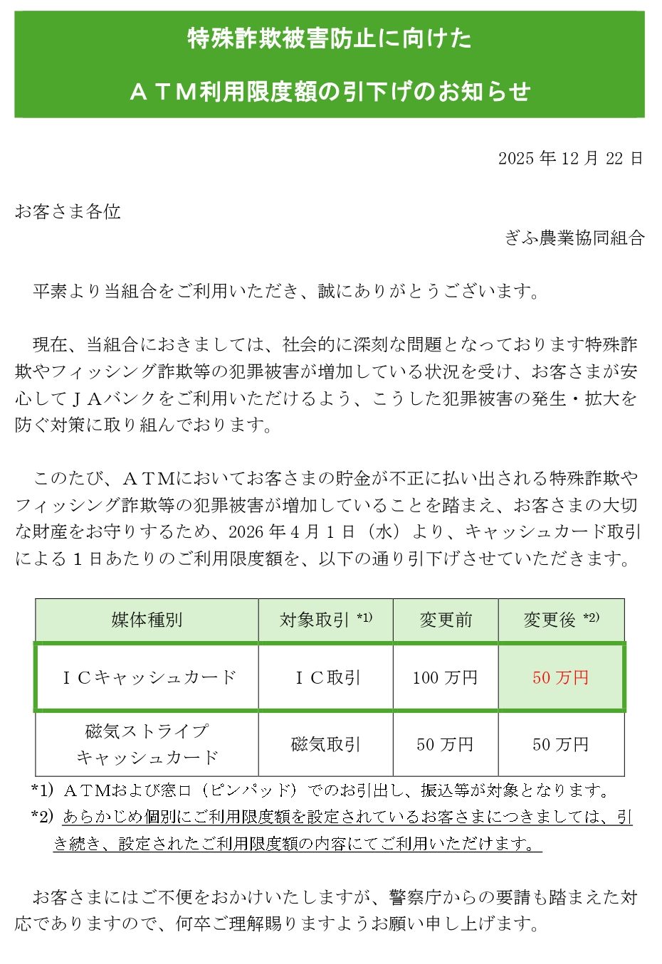 特殊詐欺被害防止に向けたATM利用限度額の引下げのお知らせ
