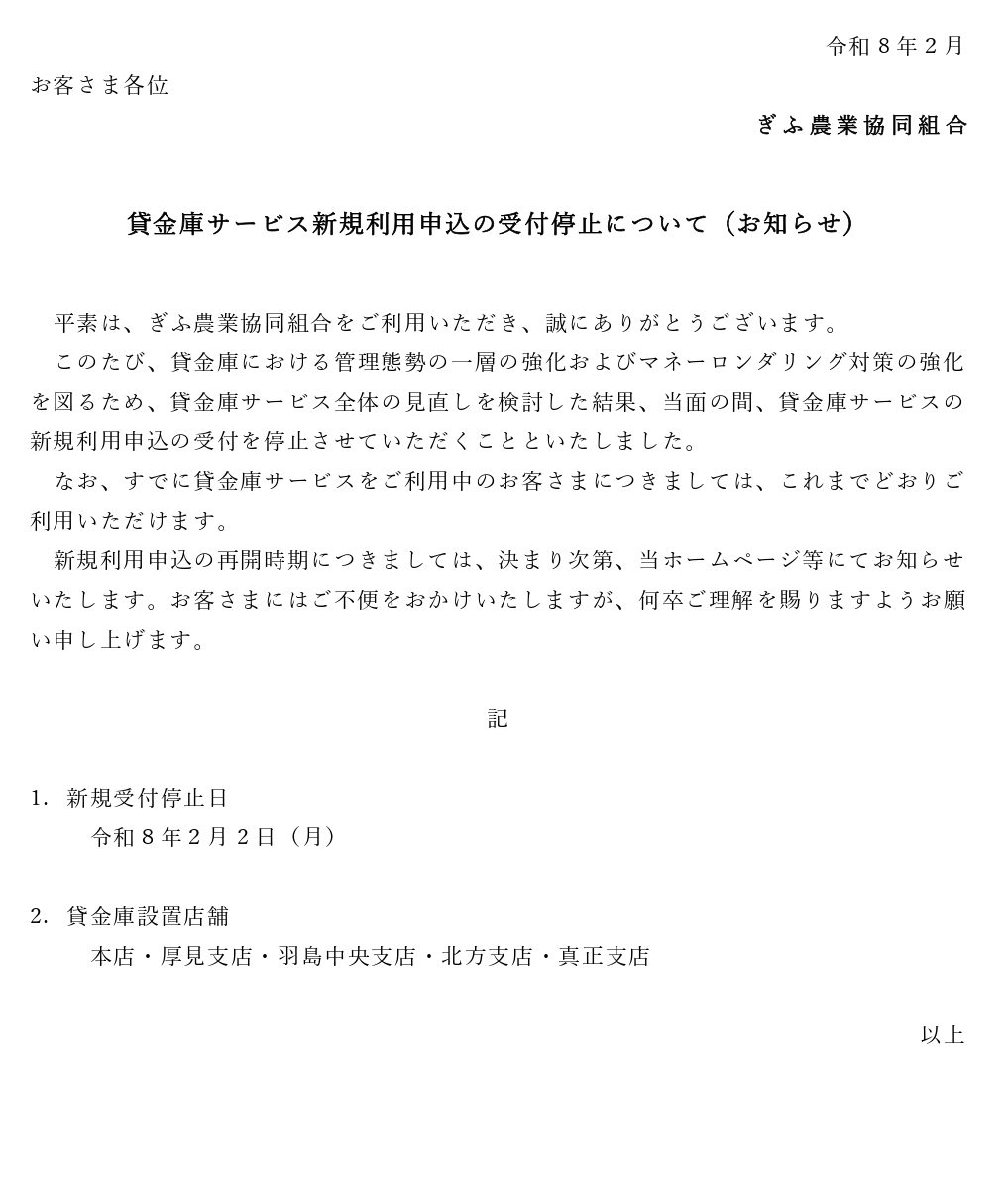当組合では令和8年2月2日(月)より貸金庫サービスの新規受付を停止させていただきます。なお、すでに貸金庫サービスをご利用中のお客さまにつきましては、これまでどおりご利用いただけます。お客さまにはご不便をおかけいたしますが、何卒ご理解を賜りますようお願い申し上げます。