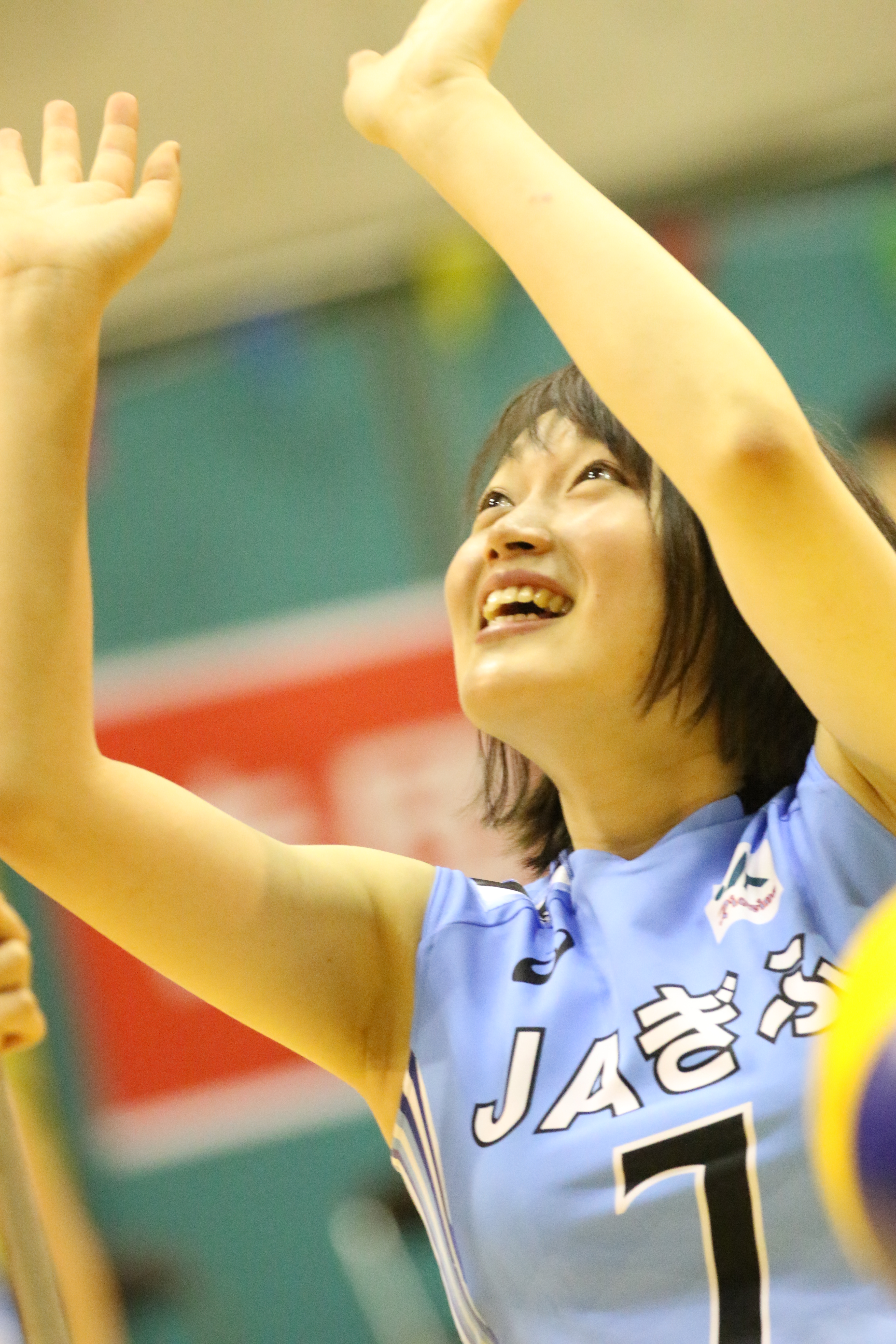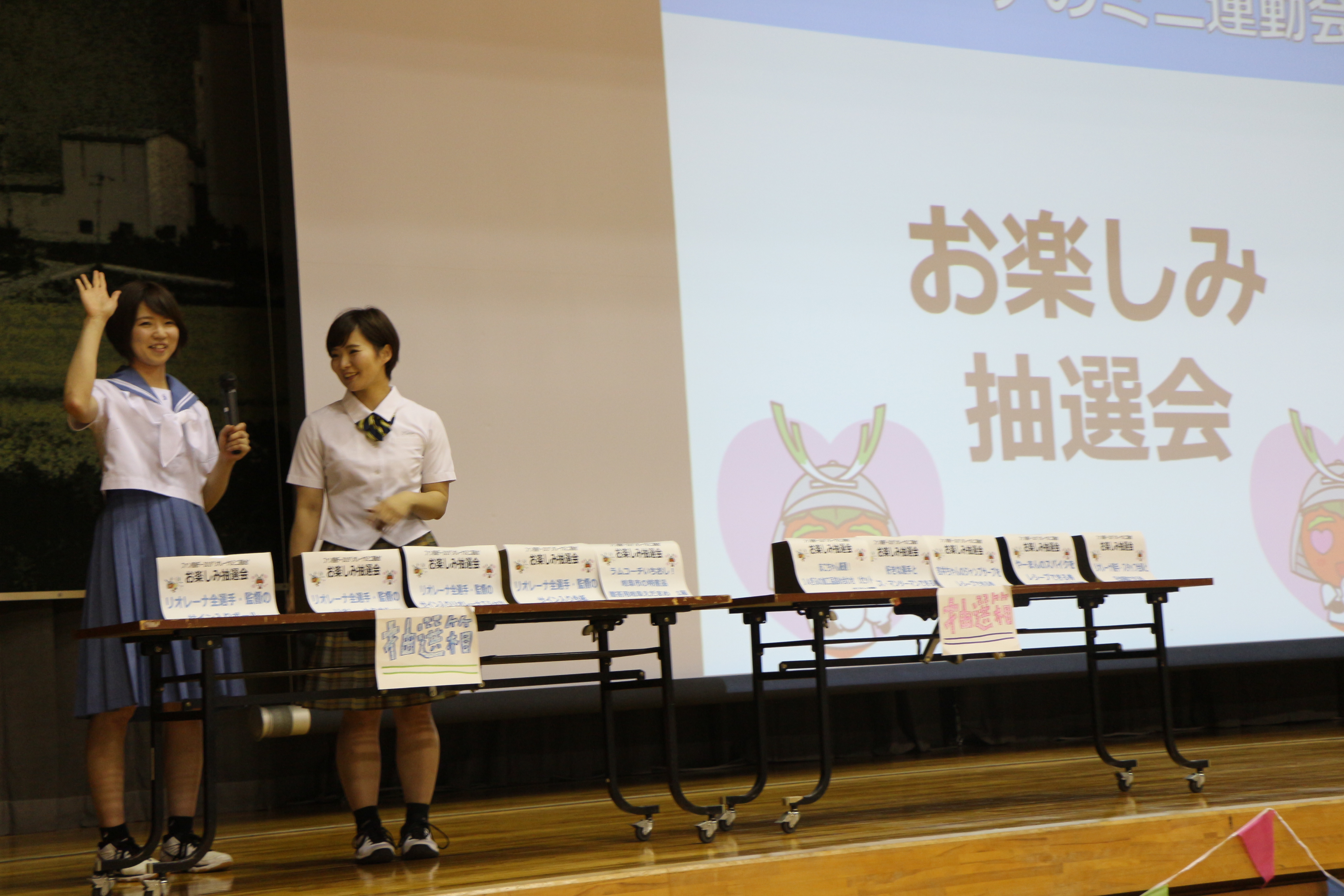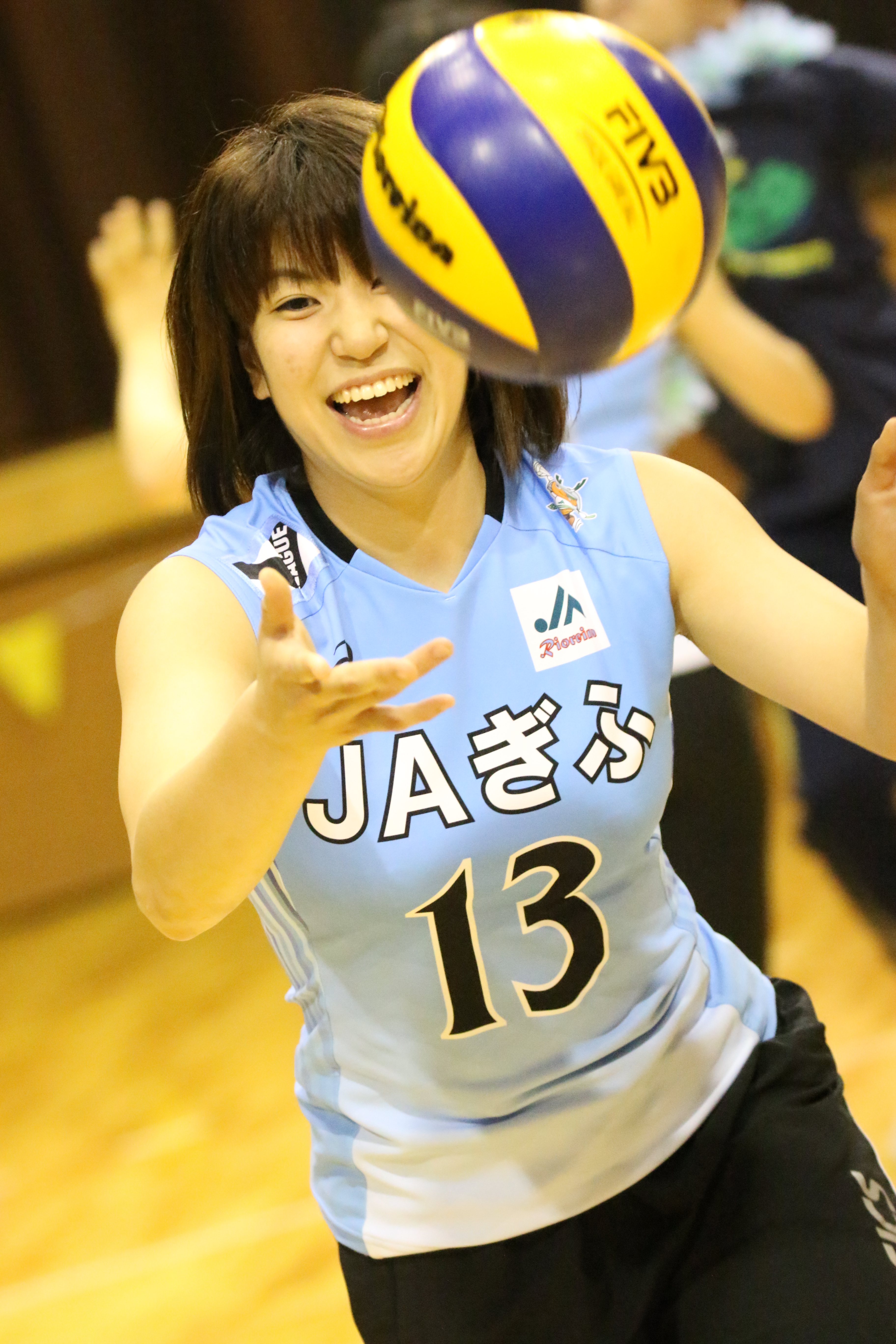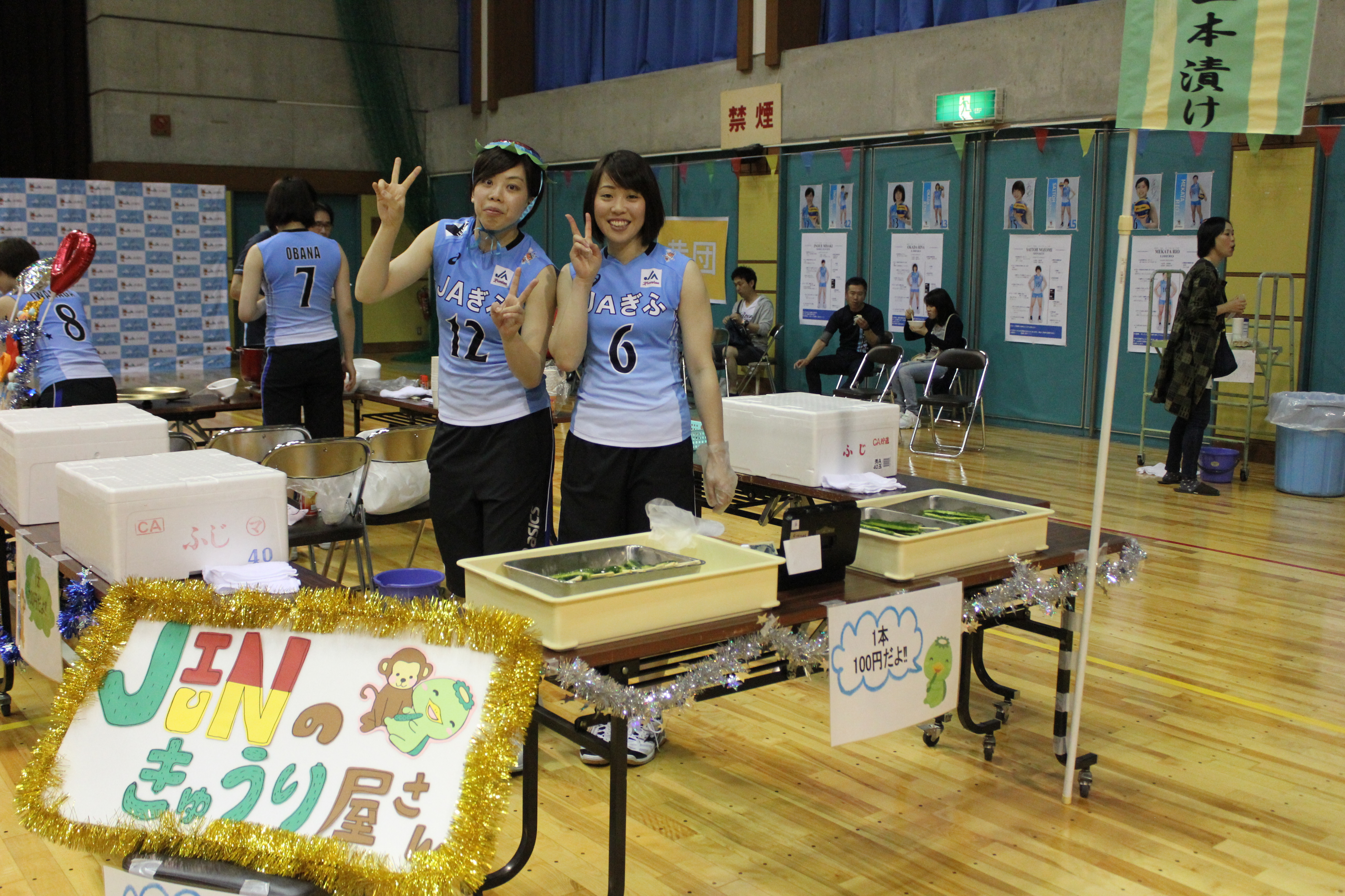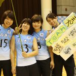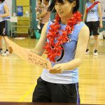 抽選会の司会、岩永選手と齋藤選手は学生時代の制服のコスプレで登場。司会の2人が各景品の抽選を行いました。景品には、サインボールや岐阜えだまめなどの「物」以外に、「吉井選手のジャンプサーブをレシーブできる権利」や「山本選手のスパイクをレシーブできる権利」などもご用意!見事当選した方は、なんとしっかりレシーブしていました!