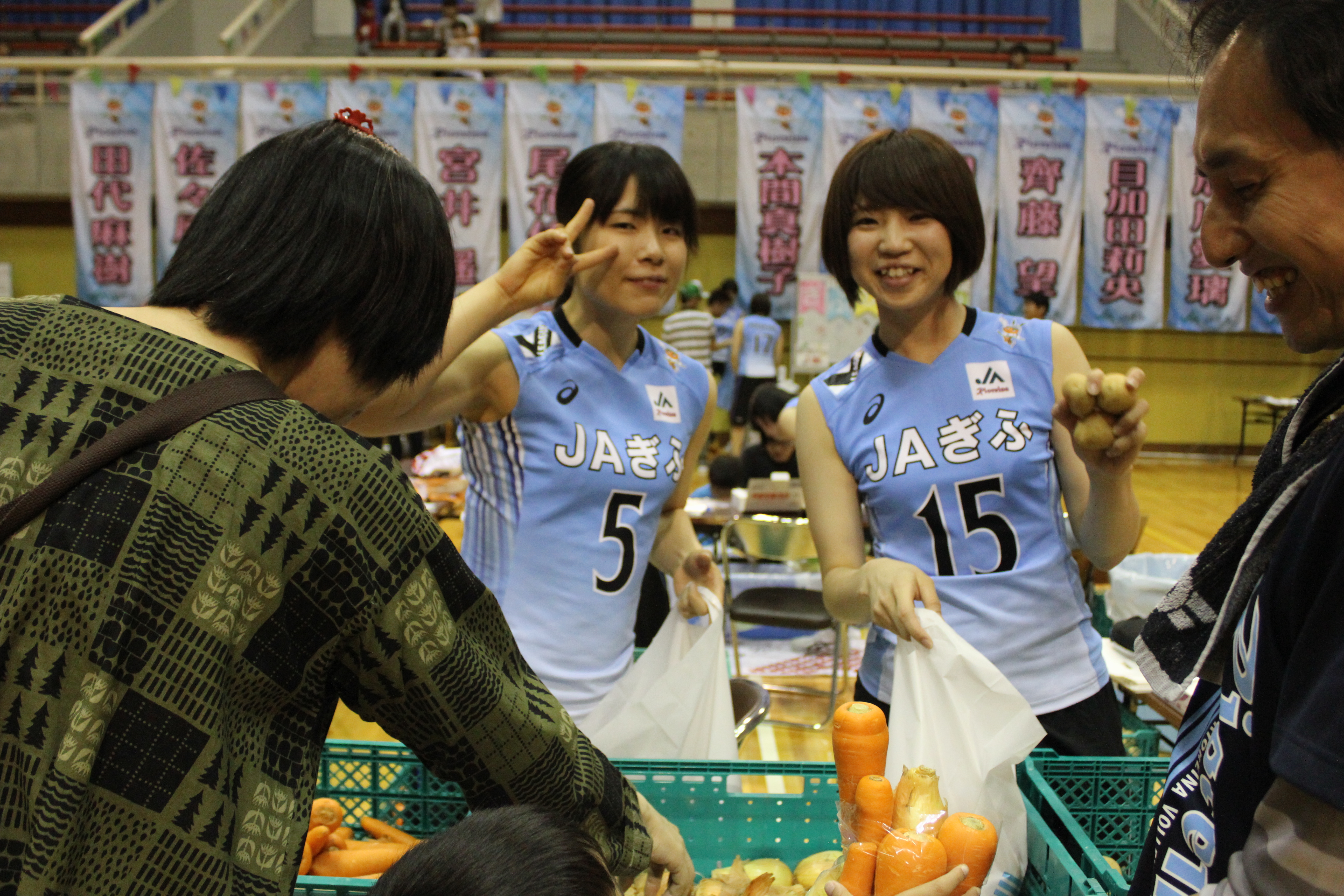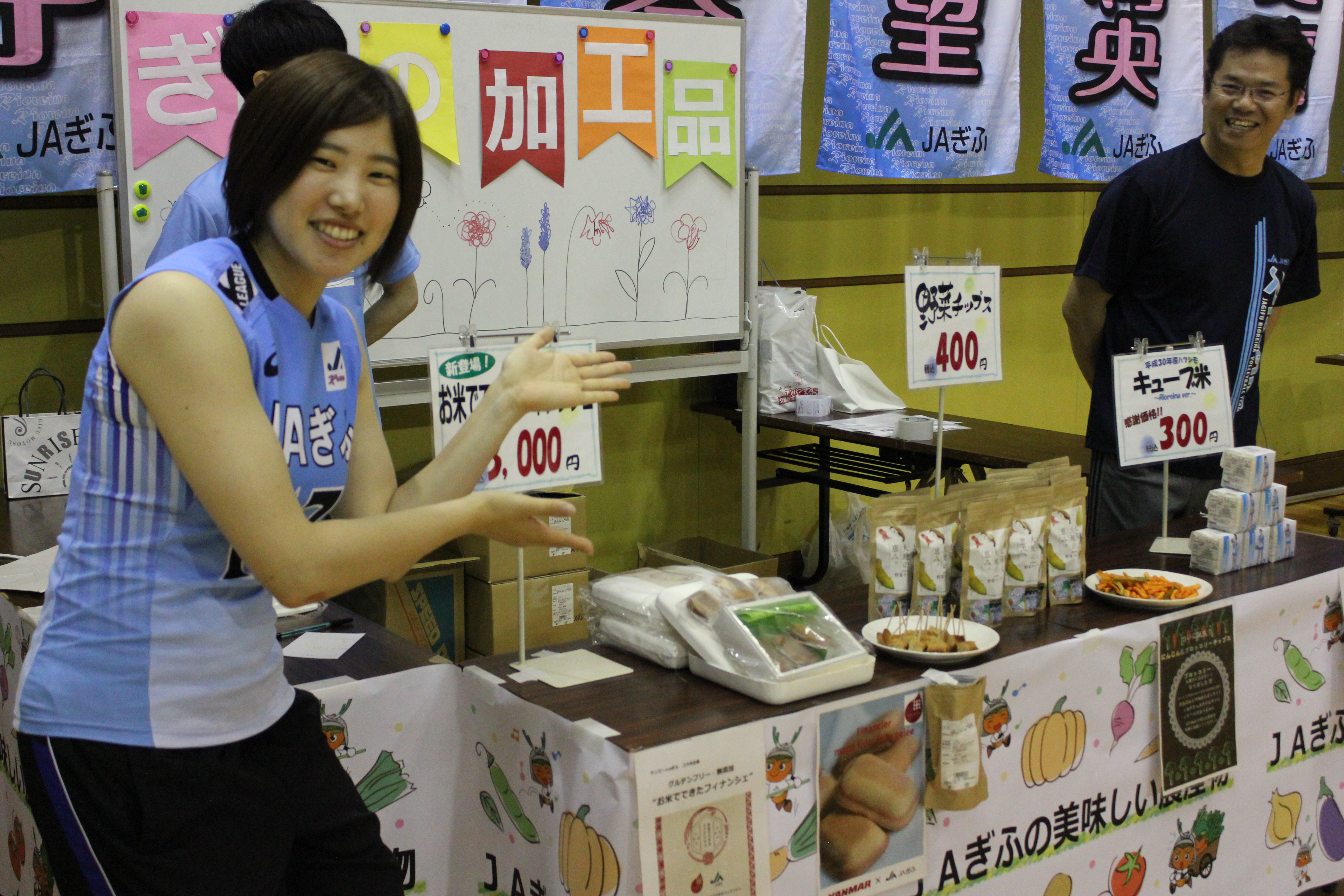 各選手の手書きのPOPや手作りの装飾などで、JAぎふ管内農産物や加工品をPRする農産物販売イベント。ファンの方とゆっくり会話をしながら交流できる笑顔あふれるコーナーとなりました。また、手作りのおにぎりと豚汁、きゅうりの一本漬け、JAぎふおんさい広場で作られた米粉パン等をその場で食べていただき、美味しさもPRできました。各選手の担当ブースは以下のとおりです。