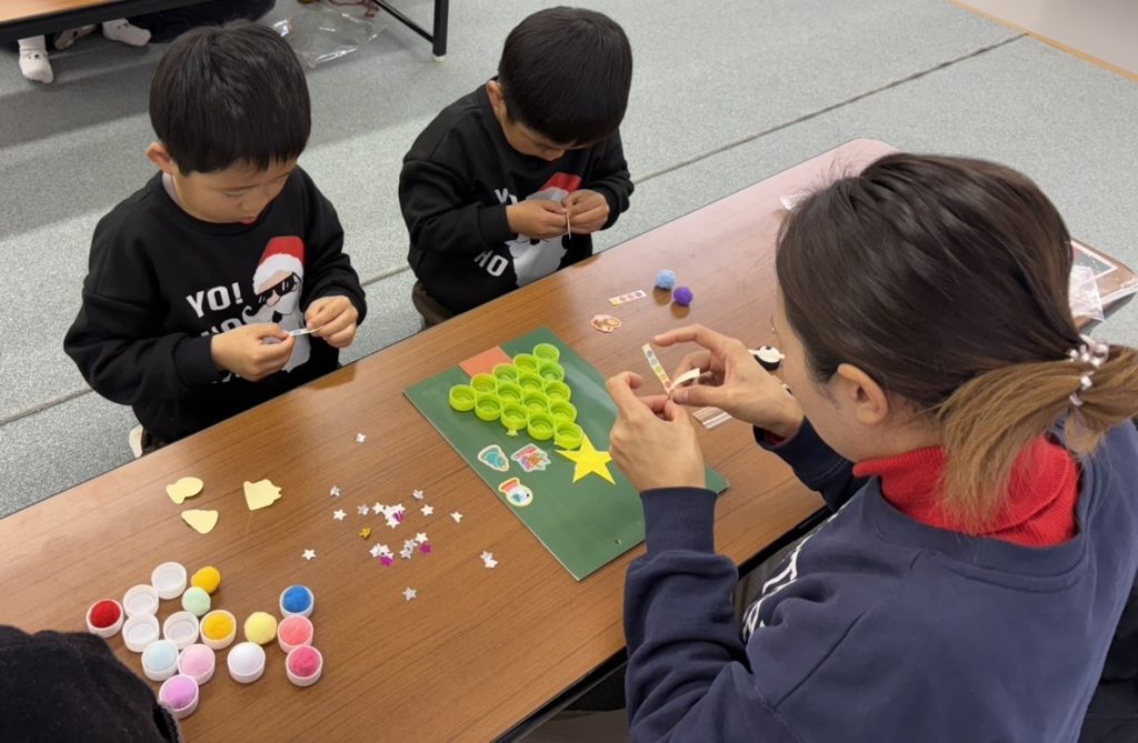 第1部では、SDGs活動の一環としてペットボトルキャップを使った「かんたんクリスマスツリー」を作りました。糊付けやシール貼り・リボンの飾りつけなど小さなお子様でも楽しむことができ、何度もポンポンを出し入れして遊ぶことができるものが完成しました。