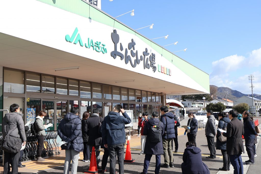 当日は、岐阜市方県地区にある有機農業の実証ほ場「有機の里」をはじめ、米の乾燥調製・保管施設の「方県カントリーエレベーター」、イチゴの出荷調整施設「いちごパッキングセンター」、㈱JAぎふはっぴぃまるけが運営する「まめなかな味噌加工所」、同JA産直店舗「おんさい広場鷺山」を巡り、地域農業の現状や各施設の役割について説明しました。併せて、同JAの農産物独自栽培基準「ぎふラル」の農産物を盛り込んだ「ぎふラル弁当」を振る舞い、地元農産物を味わってもらいました。